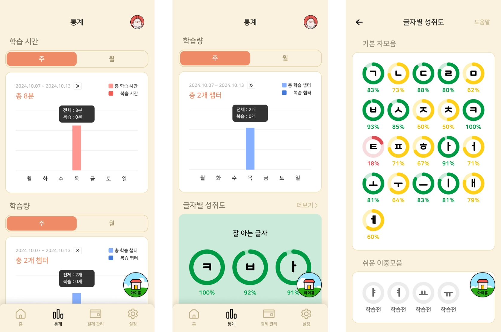 글자별, 게임별 성취도